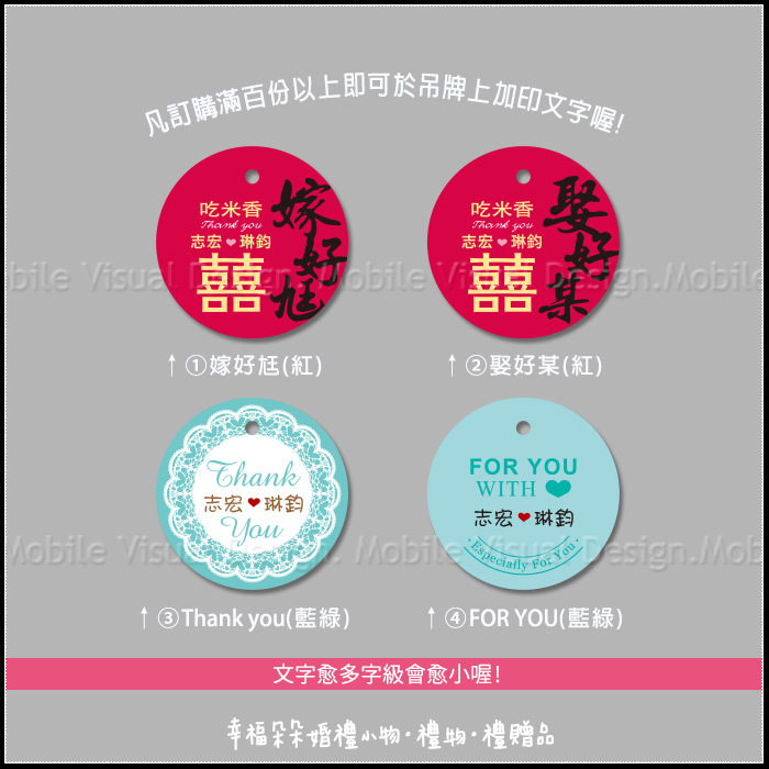 我們提供了4款精美吊牌:① 嫁好尪(紅)、② 娶好某(紅)、③ Thank you(藍綠)、④ FOR YOU(藍綠),並分別繫上粉橘色系和藍綠色系蝴蝶結。