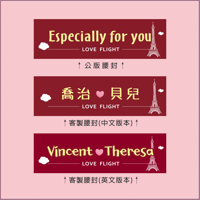 這是一款專屬於您的腰封設計,主題就是您們的名字別無其他🥰 如同飛機翱翔在天空中,是希望也是代表著朝夢想前進, 象徵著彼此的婚活開始啟航,手牽手為未來的生活一起努力吧🫶