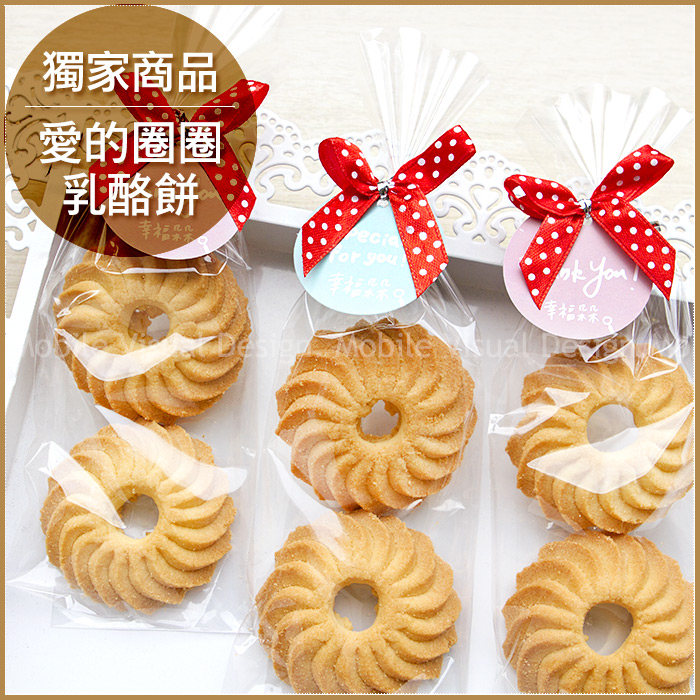 *帶有濃濃起士味的甜甜圈餅,純手工製作,超好吃! 不論是您一個人獨享的下午茶,或是送給最親愛的朋友, 都是最能帶給人愉悅心情的小點心唷! *附贈幸福朵朵獨家設計精美吊牌、蝴蝶結 及opp透明袋包裝 包裝完成做好保護才送到您手中喔! 300份以上,再優惠14/份 500份以上,再優惠13/份 1000份以上,再優惠12/份 (若遇其它優惠活動不可同時使用) |