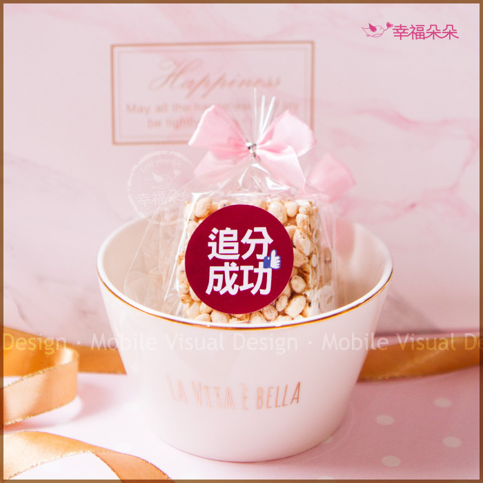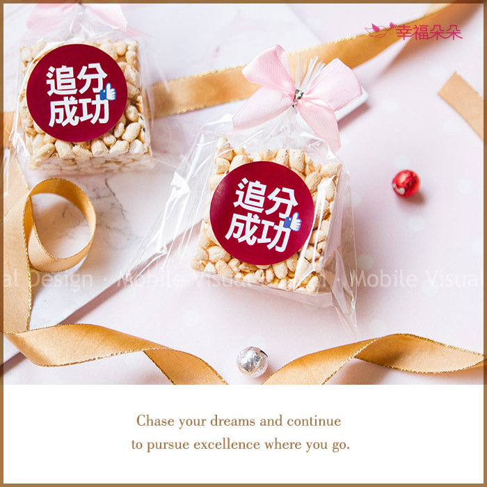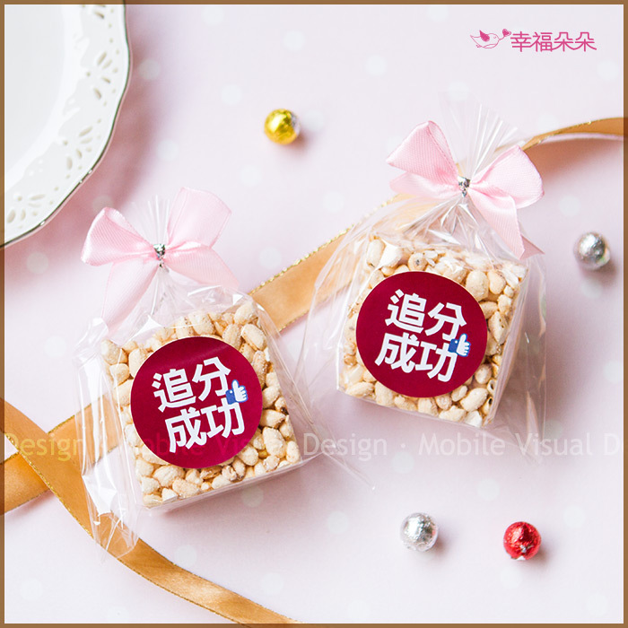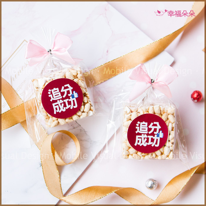 🧡米香上面貼有「追分成功」字樣 + 超級小讚讚,每一款都是幸福朵朵團隊獨家設計!美觀又可愛喔~每份均會繫上蝴蝶結裝飾,很討喜唷!作為禮物送學生及考試祝福都絕對是超棒的小禮物🧡