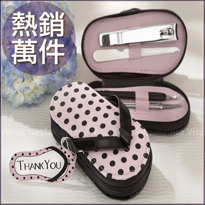 超可愛點點粉紅夾腳拖造型設計, 裡面是超實用的4件修容組唷😀 有指甲剪、修飾刀、小剪刀、小夾子~ 讓您增添可愛的粉紅泡泡心情! (也有著託付終生涵義喔😳) 兼具美觀及時尚感喔~ 在小地方多一點點的用心, 就可以讓親友感受到多一點點的心意呢! 可當抽獎品、探房禮、工作人員謝禮、 伴娘禮都是非常好的選擇👍 |