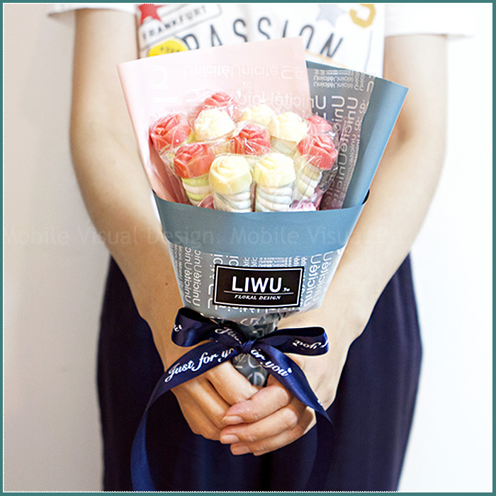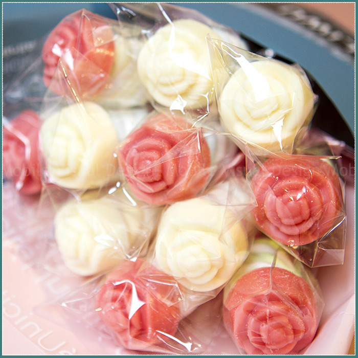 *花束中,每支都是立體玫瑰造型巧克力搭配捲捲棉花糖花棒