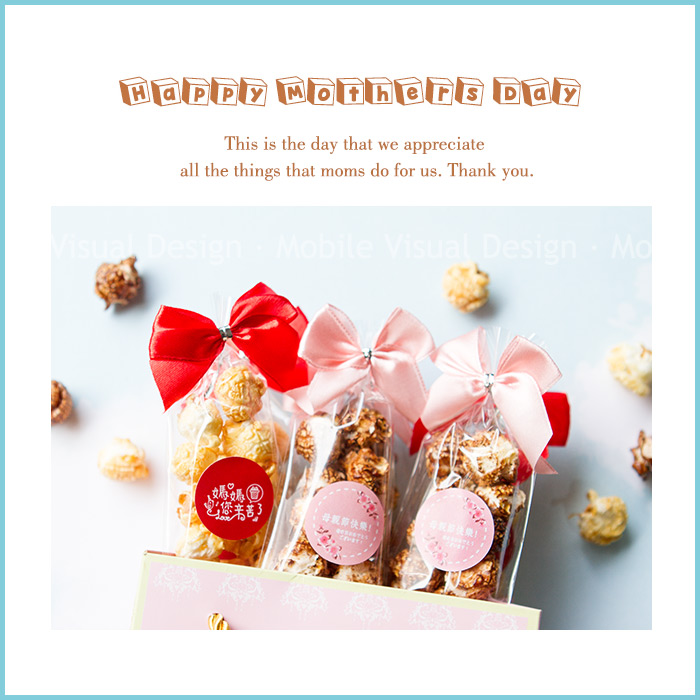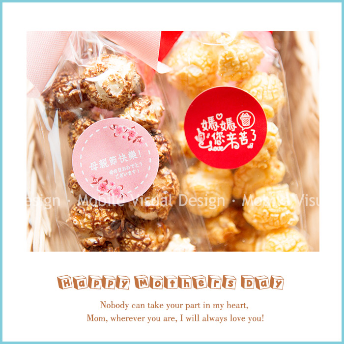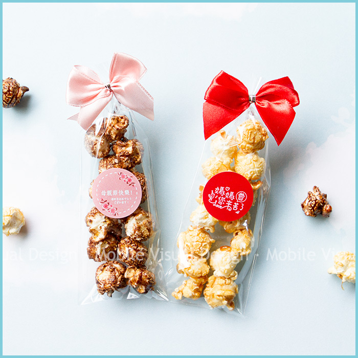 此款「蘑菇型」爆米花口味有2種可選😍💛 不惜成本採用美國非基因改造頂級玉米粒、純正植物油製作, 小地方皆可看到我們的用心唷😋 共有2種口味可挑: 焦糖口味 (紅底媽媽辛苦了貼紙)、巧克力口味 (粉底母親節快樂貼紙)