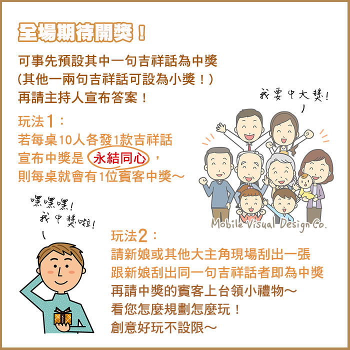 💋玩遊戲必備用品,每人一張,刮中的來賓可上台領獎, 跟全場來賓動炒熱活動氣氛,主持人可靈活運用, 賓主盡歡!大朋友小朋友也很開心喔! 💋幸福朵朵團隊獨家設計!可愛又溫馨喔! 💋屬台灣優質專業印刷廠印製, 並採用250P的進口卡紙單面彩色印刷,