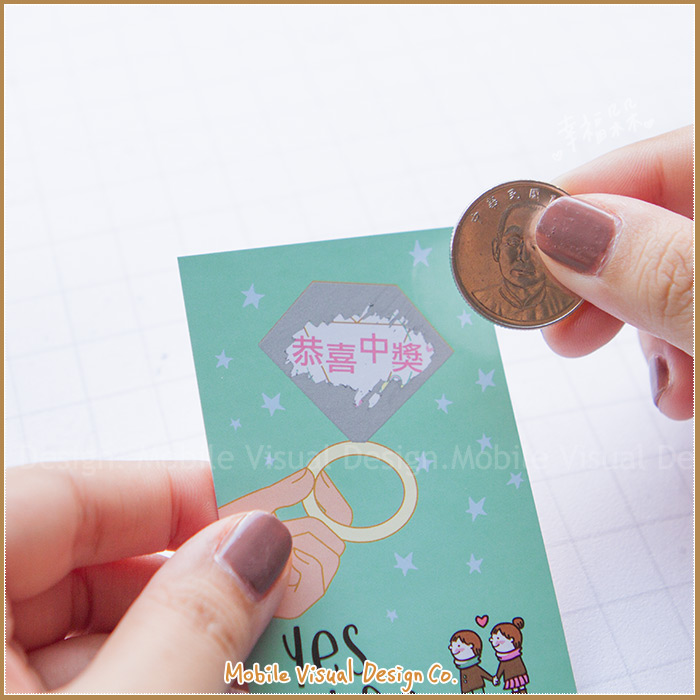 💋玩遊戲必備用品,每人一張,刮中的來賓可上台領獎, 跟全場來賓動炒熱活動氣氛,主持人可靈活運用, 賓主盡歡!大朋友小朋友也很開心喔! 💋幸福朵朵團隊獨家設計!可愛又溫馨喔! 💋屬台灣優質專業印刷廠印製, 並採用250P的進口卡紙單面彩色印刷,
