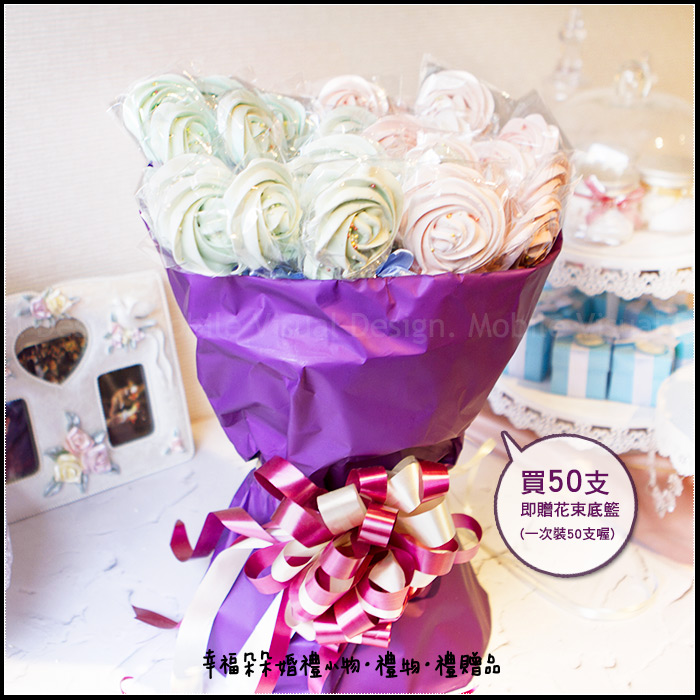 抽取式花束-玫瑰馬林糖X50支+搭贈花束底籃1個(紫)(限宅配) (新品上市特價中) |