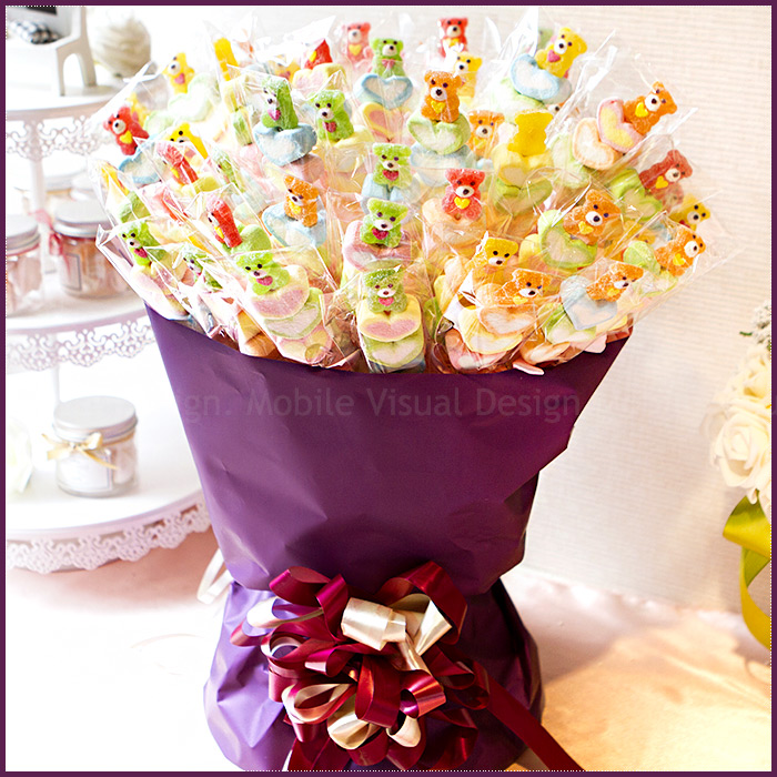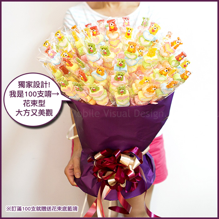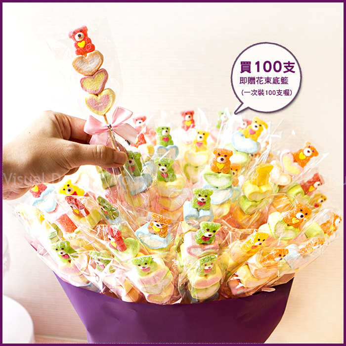 抽取式花束-QQ小熊軟糖+愛心棉花糖串X100支+花束底籃(紫)X1個(限宅配)