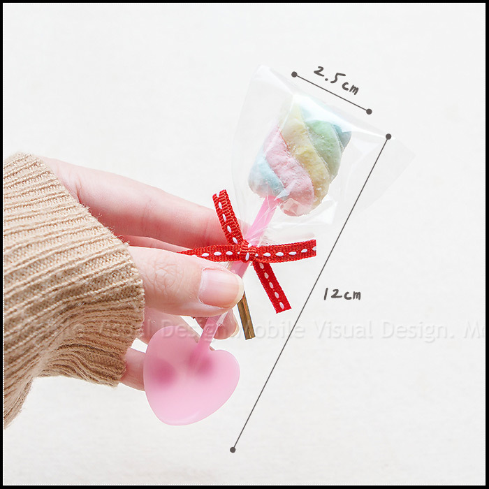 棉花糖本體約2.5cm x 4cm (含愛心鏟子則為2.5cm x 12cm) 內容物手工製作,多少會有些微誤差喔! 不介意才下訂