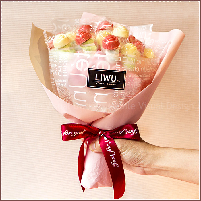*花束中,每支都是立體玫瑰造型巧克力搭配捲捲棉花糖花棒