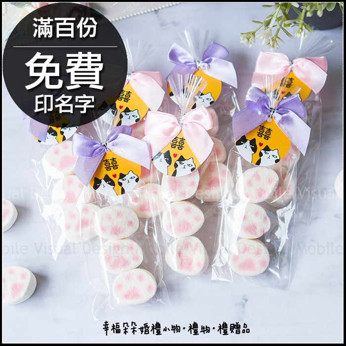 【商品特色】 超可愛貓爪造型棉花糖,口感綿綿的,吃起來甜在心頭😋 再綁上粉嫩的蝴蝶結以及超熱門「貓起來愛」囍字吊牌! 就是要讓賓客一起感受到您們的幸福是多麼甜🤭 送客人送小朋友也適合噢💖 哇!! 好甜好甜😳 *接單後新鮮現做交貨(趕件者請先詢問時間),賞味期約1年。 #兒童節禮物 #活動禮贈品 #來店禮 #情人節 #生日派對 #萬聖節 #生日分享 #聖誕糖果 #聖誕節 #交換禮物 #會場佈置 #二次進場 #活動獎品 #兒童獎品 #園遊會 #特別獎品 #candybar #婚禮小物專賣店 ----------🌹 幸福朵朵 感謝您的光臨 💍-----🍎 祝您平安幸福快樂 😘 ------- ♥︎若大量訂購下訂前務必先詢問庫存數是否足夠喔! |