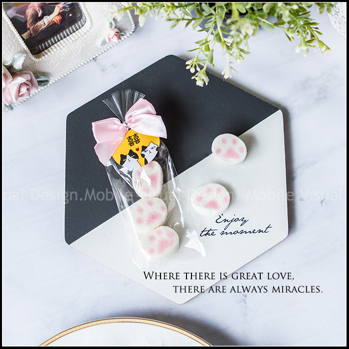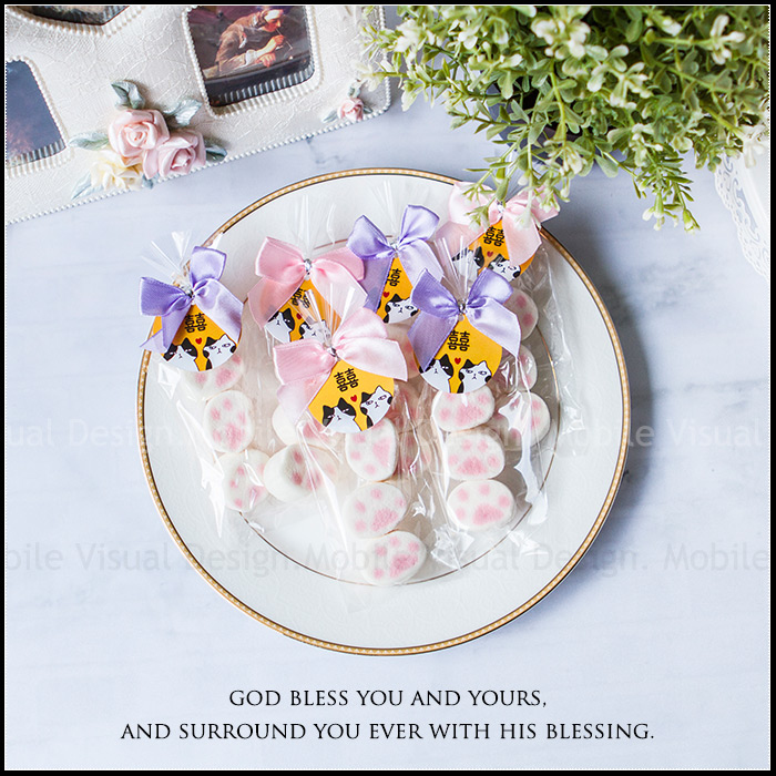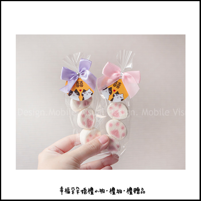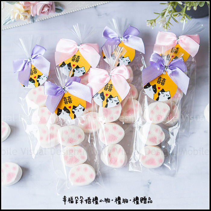【商品特色】 超可愛貓爪造型棉花糖,口感綿綿的,吃起來甜在心頭😋 再綁上粉嫩的蝴蝶結以及超熱門「貓起來愛」囍字吊牌! 就是要讓賓客一起感受到您們的幸福是多麼甜🤭 送客人送小朋友也適合噢💖 哇!! 好甜好甜😳