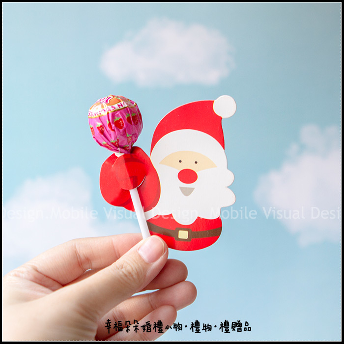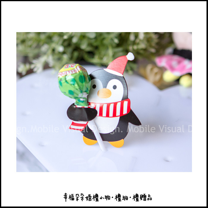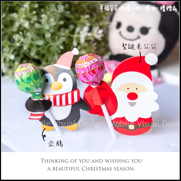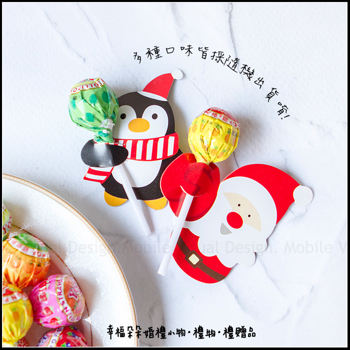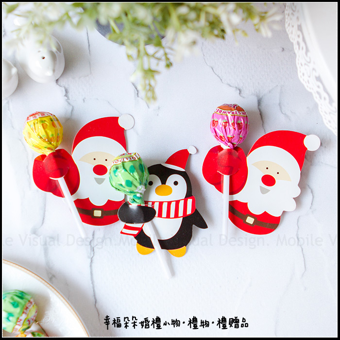 單支棒棒糖約直徑3cm圓x高8.7cm 聖誕老公公裝飾紙卡約7.1x7.8cm 企鵝裝飾紙卡約6.1x8cm |