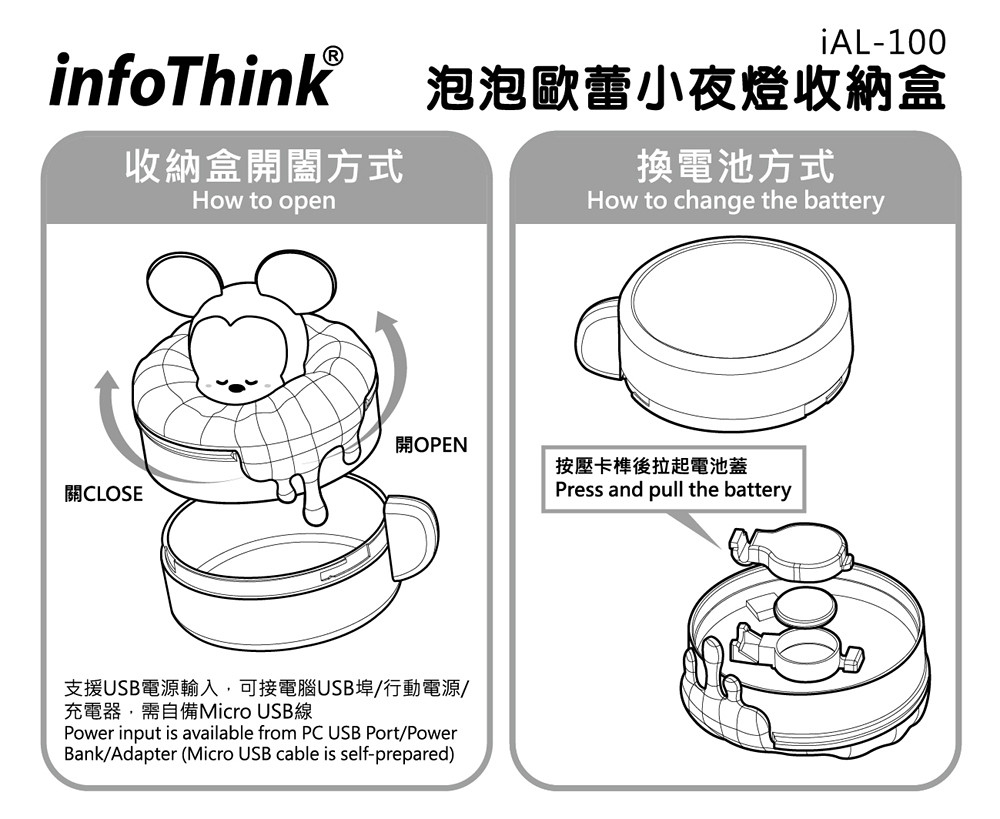 | 商品說明 | 以享受咖啡奶泡浴為設計出發點 化身為辦公桌/書桌/化妝台上的超療癒小物 ● 經典角色元素設計 ● 結合小夜燈與收納盒設計 上蓋附有柔和小夜燈,也可打開蓋子收納項鍊、戒指、其他紀念小物等等。 可使用2種供電方式: 1.CR2032鈕扣電池1顆 2.插Micro USB線:DC 5V/0.5A 商品規格 燈源:白光LEDx4 材質:PC/PVC 尺寸:約97x85x100mm 重量:約100g 產地:台灣 【顛覆思維,挑戰創意極限】 ˙驚喜互動式LED燈光展示特效!!! ˙哄小孩必備3C商品