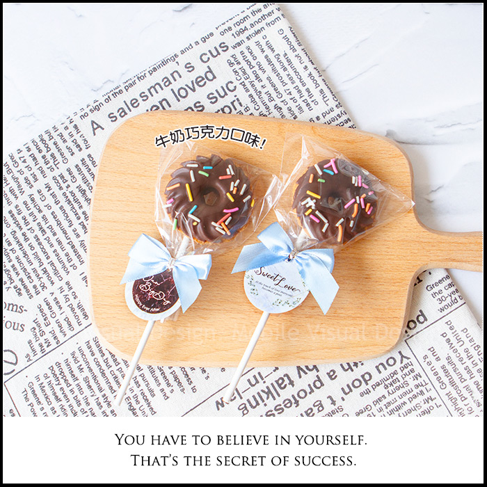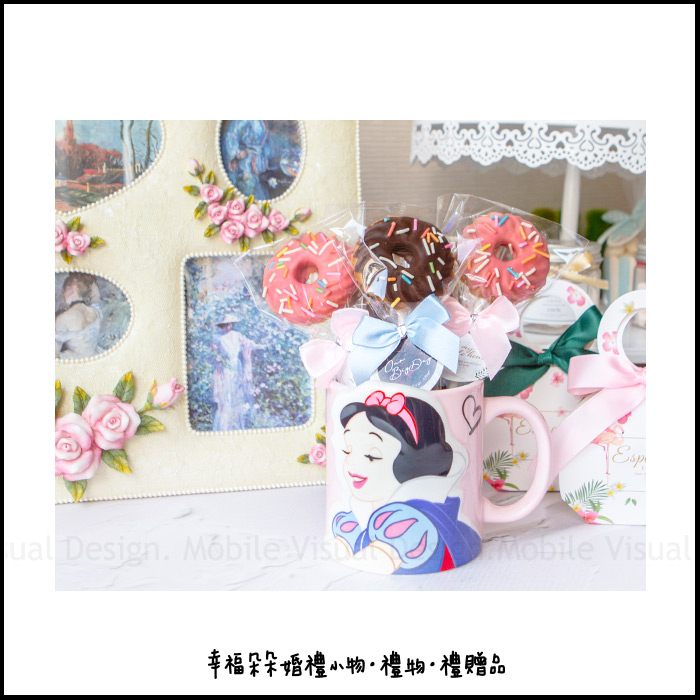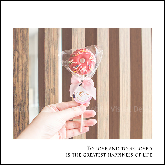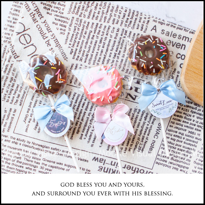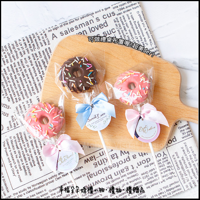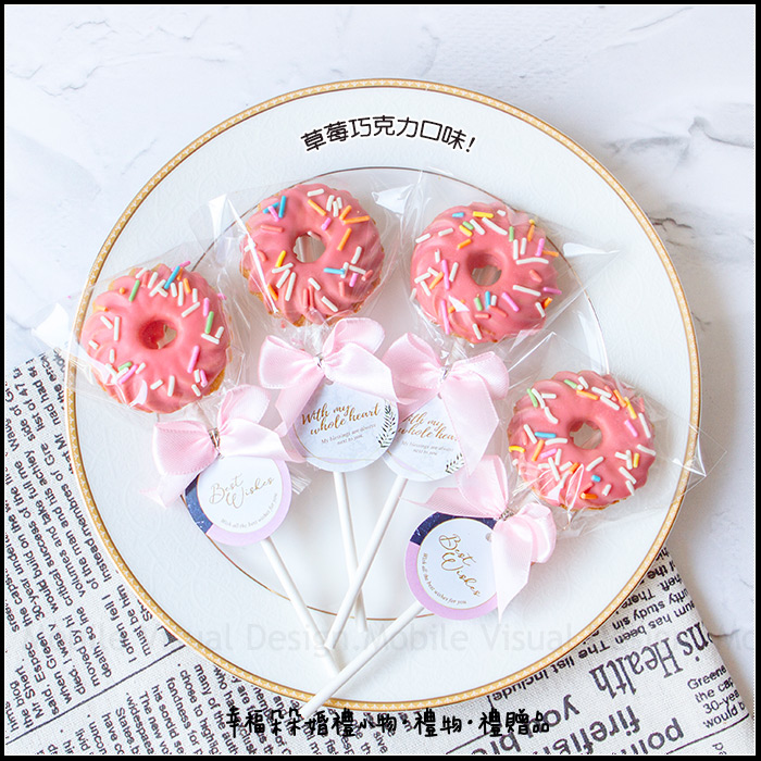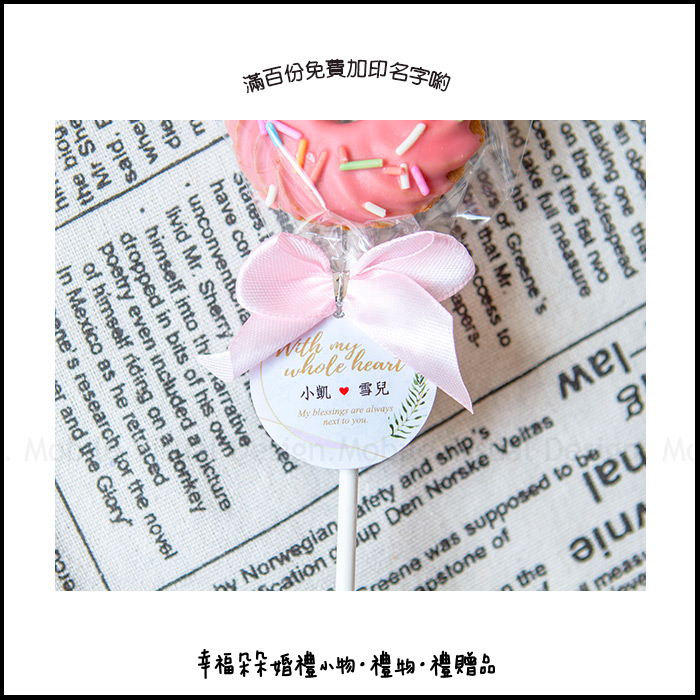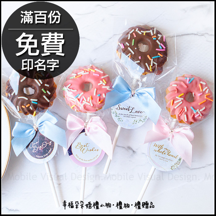 帶有濃濃起士味的甜甜圈餅乾裹上美味巧克力, 灑上繽紛彩針糖珠,純手工製作,超好吃😋 都會為您繫上幸福朵朵獨家設計精美吊牌 分別隨機並繫上粉色及藍色素面蝴蝶結,非常俏皮可愛! 作為婚禮分送親友或活動送客都很棒喔🧡