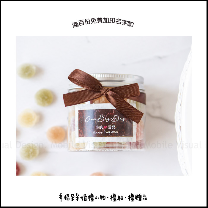 *繽紛水果口味,可愛又美味🧡 可做休閒零嘴或加入冰品,非常好吃喔😋 *每份都有透明罐裝,並都貼有幸福朵朵獨家設計精美貼紙,訂滿100份還可以免費印名字喔!(若有需要,請在下單時就備註好要印的名字喔!沒有備註就會用公版貼紙喔!) *若時間足夠,建議可提前7-14天以上預訂 (急用者請先詢問時間~亦可趕件)謝謝您!! 採接單後新鮮包裝,保存期限有半年以上 *每罐約47顆,重量約83g(含罐重量為100g左右) *保存方式:存放於乾燥陰涼處即可 *保存期限:至少半年以上 最佳賞味期2~3週內 *當送客喜糖、二次進場禮、工作人員的感謝禮、婚企活動禮、婚禮抽獎、婚禮會場佈置、工商來店禮、自用,增添許多浪漫的氣息喔.........。
