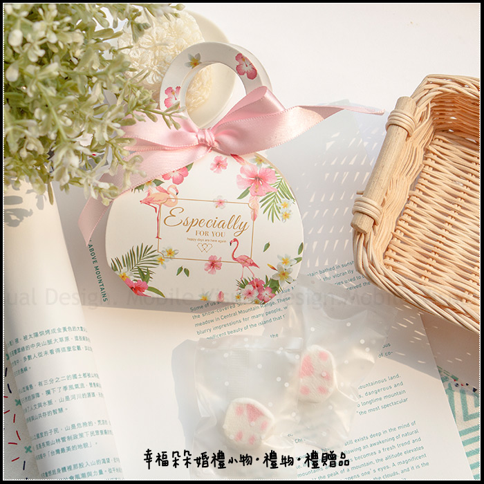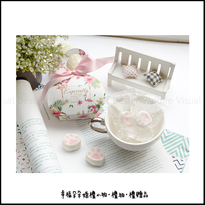 最佳賞味期2~3週內 *每組含:貓爪棉花糖2顆+(粉緞)熱帶雨林盒1份 (喜糖盒需自行DIY.DIY教學詳情請參考圖9) *當送客喜糖、二次進場禮、工作人員的感謝禮、婚企活動禮、婚禮抽獎、婚禮會場佈置、工商來店禮、自用,增添許多浪漫的氣息喔.........。 *為讓商品完整地送至您手中,我們會做好保護,再做配送喔! (此商品已包裝好才寄送給您唷~~)