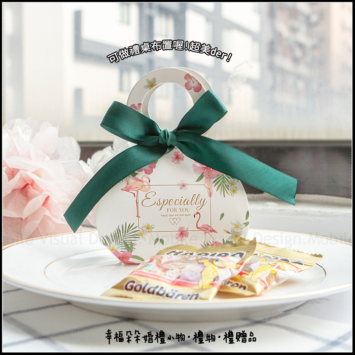 最佳賞味期2~3週內 *每組含:德國小熊軟糖2小包+(綠緞)熱帶雨林盒1份 (喜糖盒需自行DIY.DIY教學詳情請參考圖8) *當送客喜糖、二次進場禮、工作人員的感謝禮、婚企活動禮、婚禮抽獎、婚禮會場佈置、工商來店禮、自用,增添許多浪漫的氣息喔.........。 *為讓商品完整地送至您手中,我們會做好保護,再做配送喔! (此商品已包裝好才寄送給您唷~~)