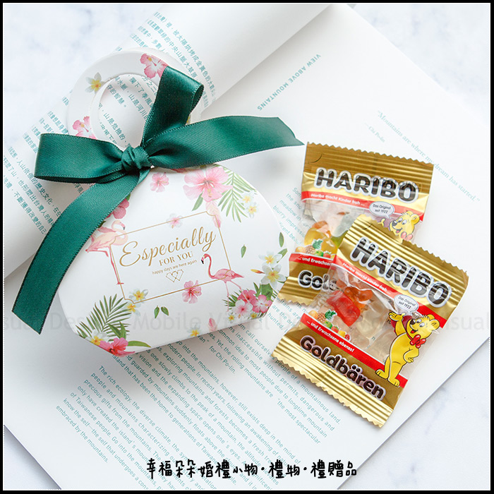 超可愛德國小熊軟糖加上歐風手提包喜糖盒,拿來迎賓擺桌不但精緻大方,吃起來QQ可口~~讓人甜在心頭😋 送客人送小朋友都好適合噢💖 在小地方多一點點的用心,就可以讓親友感受到多一點點的心意呢! *若時間足夠,建議可提前7-14天以上預訂 (急用者請先詢問時間~亦可趕件)謝謝您!! 採接單後新鮮包裝,保存期限有半年以上 *保存方式:存放於乾燥陰涼處即可 *保存期限:至少半年以上