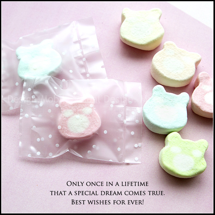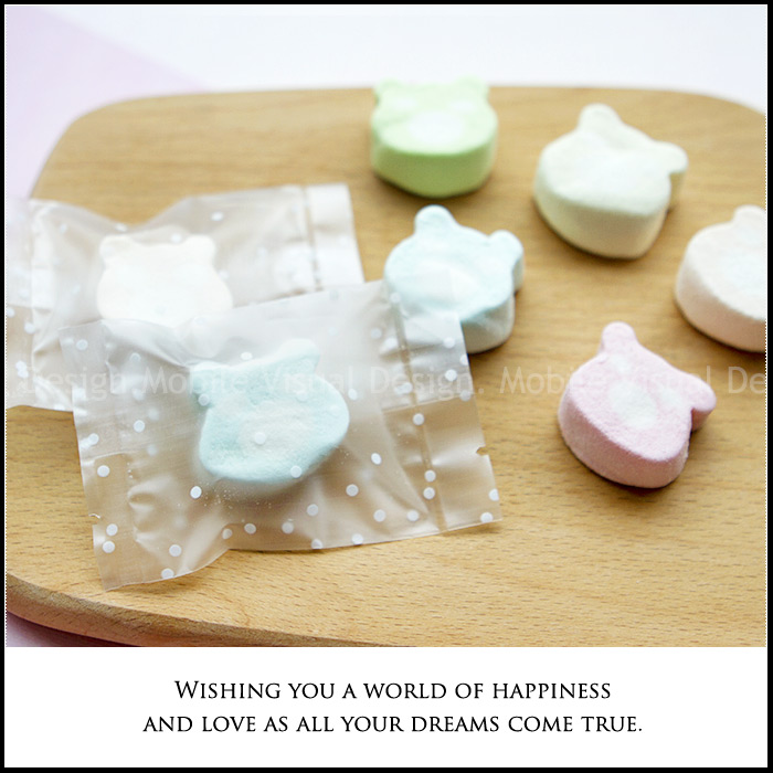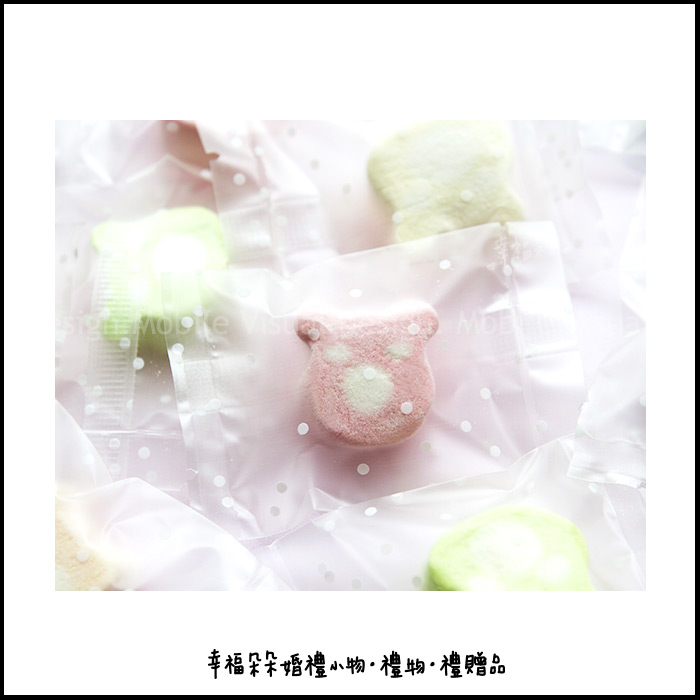 *超可愛小熊造型棉花糖,口感綿綿的,吃起來甜在心頭😋 送客人送小朋友都好適合噢💖 *每個皆用磨砂袋封口,非常精美喔! *無基本訂量,皆可零售購買。 *保存方式:存放於陰涼處不日曬即可。 *保存期限:至少半年以上。 *當送客喜糖、二次進場禮、生日糖果、派對、過年糖果、婚禮會場佈置、工商來店禮、自用,增添許多浪漫的氣息喔.........。