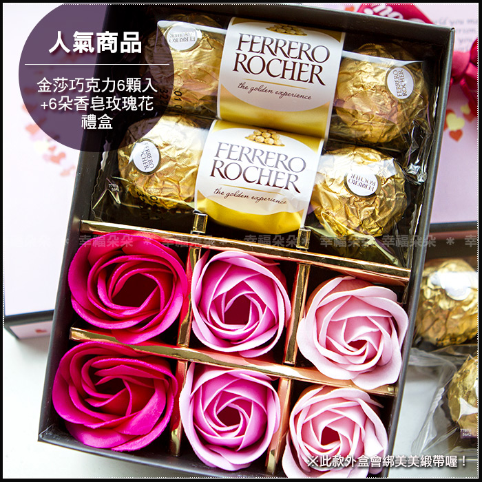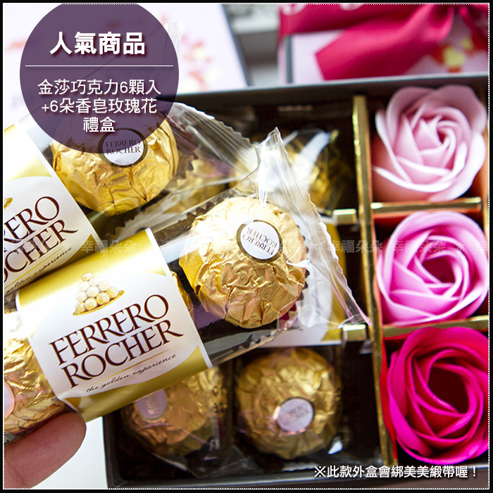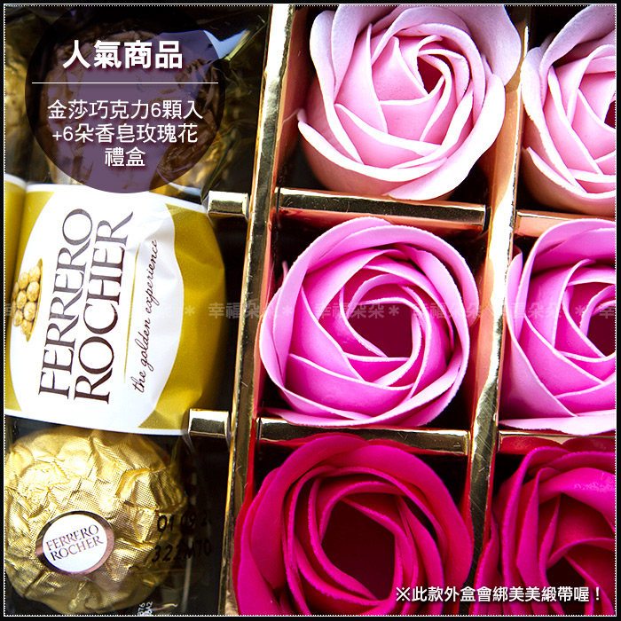 金莎巧克力6顆入+6朵玫瑰香皂花禮盒-粉紅色 (新品上市特價中) |