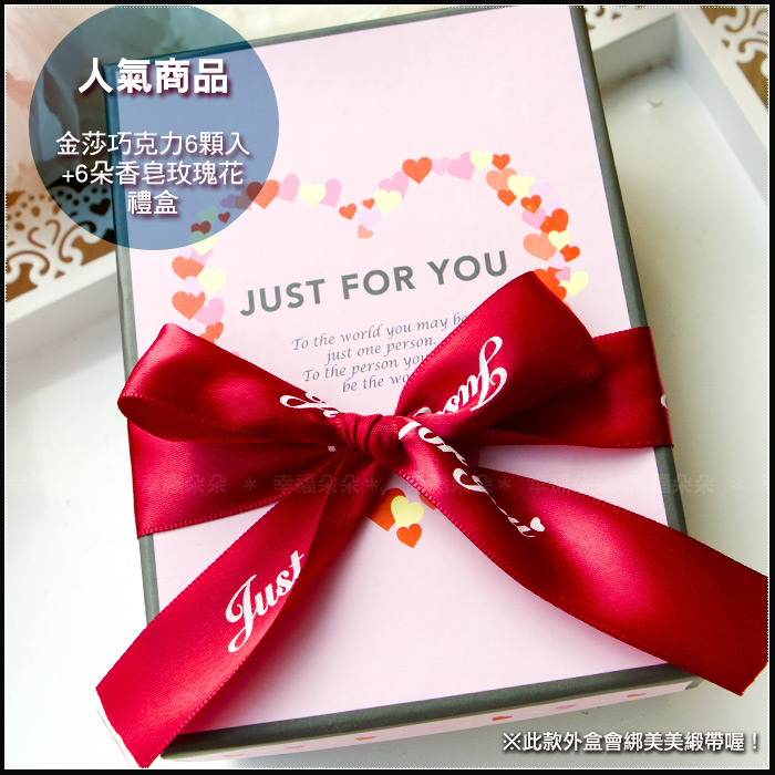 *禮盒中,有金莎巧克力X6顆+6朵香皂玫瑰花 讓收禮的人眼睛為之一亮!自己獨享,也可發送給同事、朋友, 一同歡樂! *玫瑰花是用香皂做成的喔!不會凋謝,可以永久珍藏 *做為情人節禮物、畢業禮物、父親節禮物、母親節禮物、 教師節禮物、聖誕節禮物、生日禮物都很適合喔 香皂花會散發淡淡香氣可以拿來當室內擺飾唷! 此商品僅適合拿來作室內擺飾增加氛圍感,請不要拿來洗手用😌