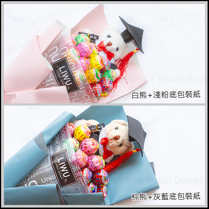 每組花束均有 20支棒棒糖 + 1隻畢業小熊 作為生日禮物或畢業季送同學都絕對是超棒的禮物喔。 包裝紙共有2色可選擇: 1.白熊+淺粉底包裝紙
