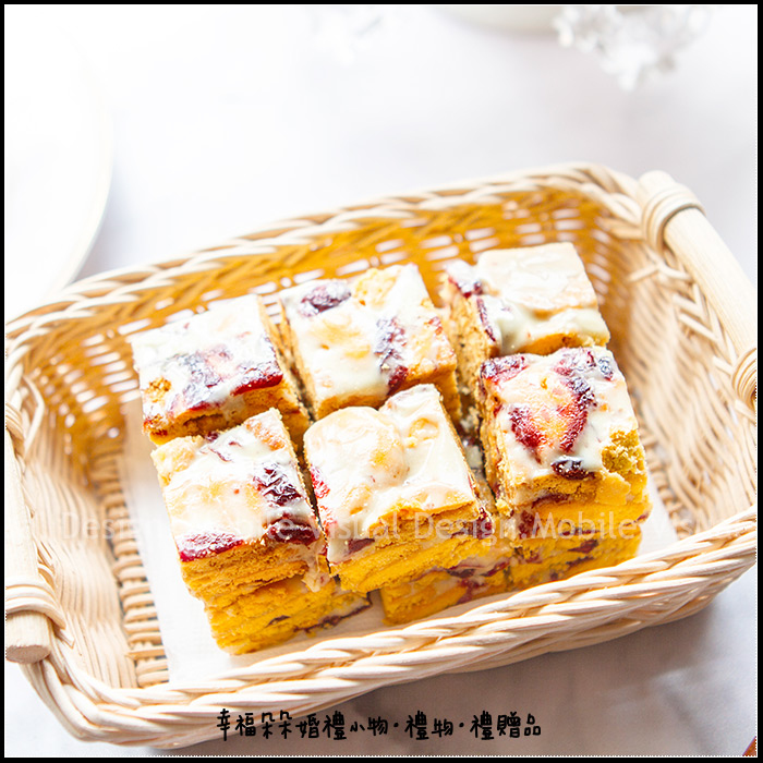 麵粉、砂糖、植物油、乳清粉、鹽、葡萄糖、膨脹劑、β-胡蘿蔔素、香料、葡萄糖漿、明膠、D-山梨醇、黏稠劑、焦磷酸鈉、食用藍色1號、蔓越莓、奶油、奶粉 .此產品內含麩質的穀物、蛋類、奶類、大豆類及其製品之過敏原。