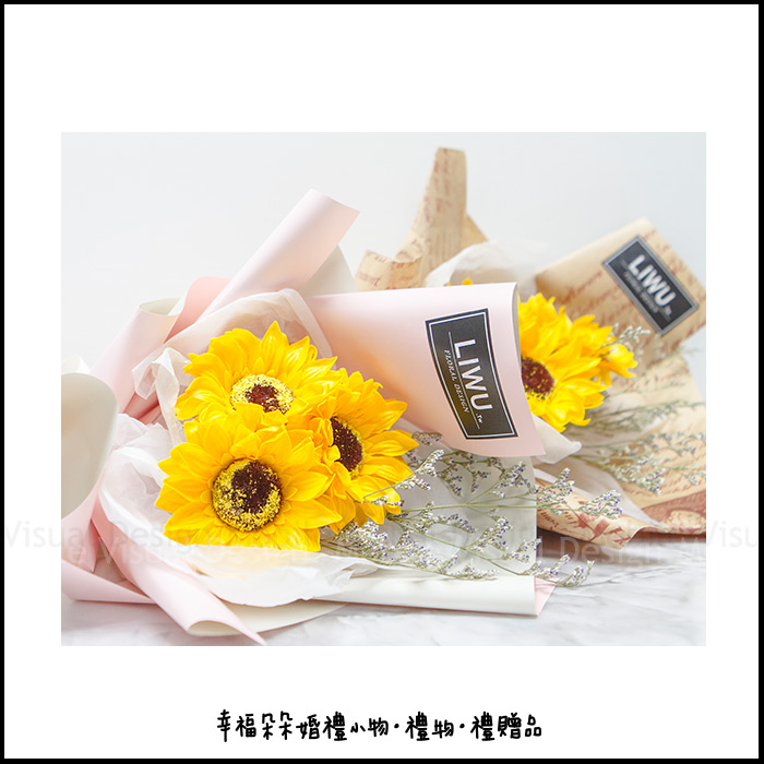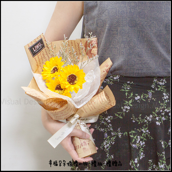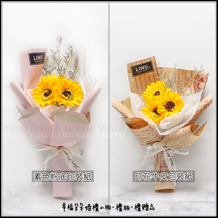 每組花束均有 3朵向日葵香皂花 + 數支情人草乾燥花 作為生日禮物或畢業季送同學都絕對是超棒的禮物喔。 包裝紙共有2色可選擇: 1.印花牛皮包裝紙