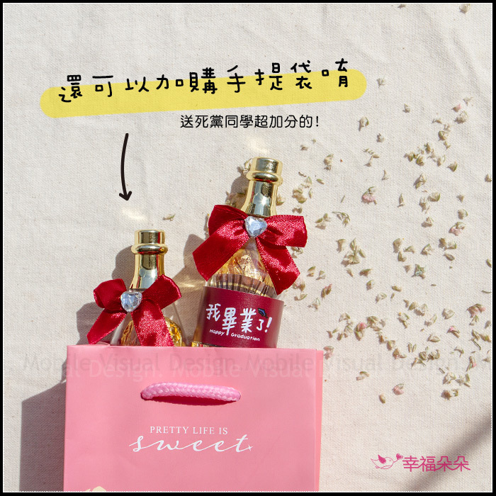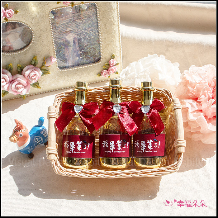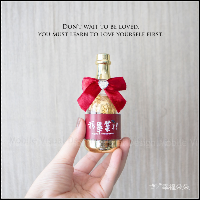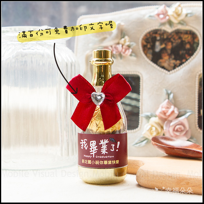 🧡迷你創意香檳瓶,代表值得慶祝的歡樂時刻! 一起來開香檳囉!啊斯! 🧡每瓶含:金莎2顆+可愛簡約的腰封設計😍 是不是超可愛呀~🤭💓 🧡腰封共有2款可挑:我畢業了、畢業快樂 🧡購買100份還可以免費幫您印上文字唷! 讓客人印象深刻!真是特別的客製小禮物👍 你們的用心一定要讓大家感受到! 🧡100份以下是公版貼紙(沒印名字) 100份以上貼紙可以免費印製名字(日期) ♥︎若大量訂購下訂前務必先詢問製作日期是否OK! 在小地方多一點點的用心,就可以讓親友感受到多一點點的心意呢! *保存方式:存放於乾燥陰涼處即可 *保存期限:至少半年以上