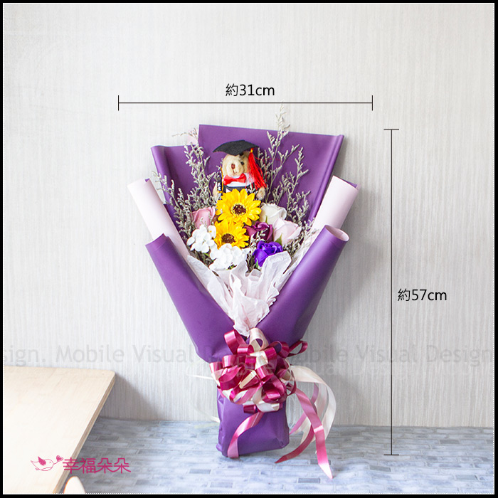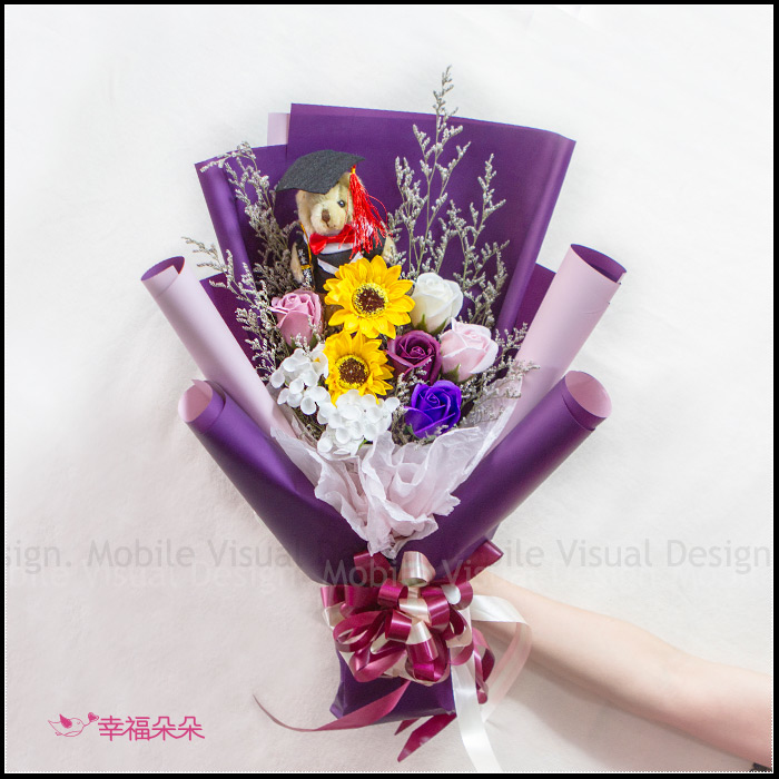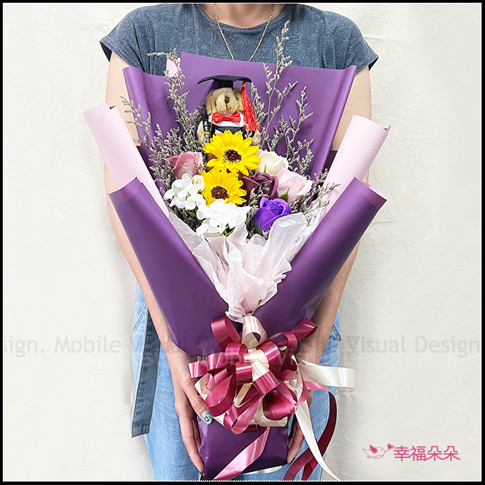 紫給心愛的 畢業花束(畢業棕熊+2朵向日葵+5朵香皂玫瑰花+繡球花+情人草)MS001 (新品上市特價中) |