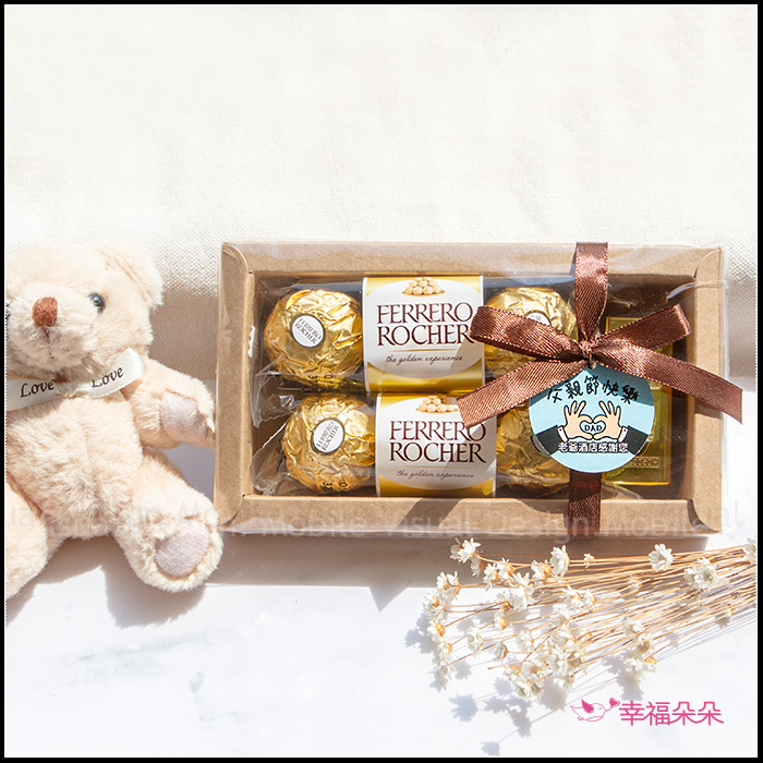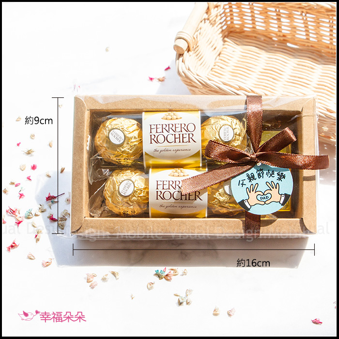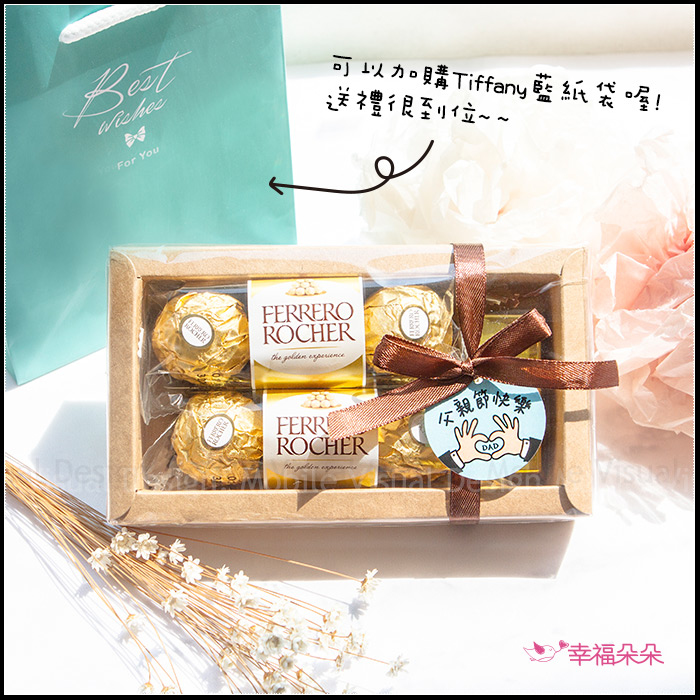 每盒均有 金莎巧克力6顆入 + 金塊磁鐵1個 作為禮物送老爸或拜訪客戶都絕對是超棒的禮物喔。 特別為父親節設計的活動創意贈品-[爸爸賺大錢]金塊磁鐵, 祝福辛苦為家庭打拼的老爸,賺錢大豐收! 每組禮物包都繫有幸福朵朵獨家設計精美吊牌,訂滿100組禮物包還可以免費印文字喔!(若有需要,請在下單時就備註好要印的文字喔!沒有備註就會用公版吊牌喔!) 保存方式:金莎巧克力存放於乾燥陰涼處即可 保存期限:至少半年以上(最佳賞味期2~3週內) 您也可以加購濾掛咖啡包給88送禮喔🌻