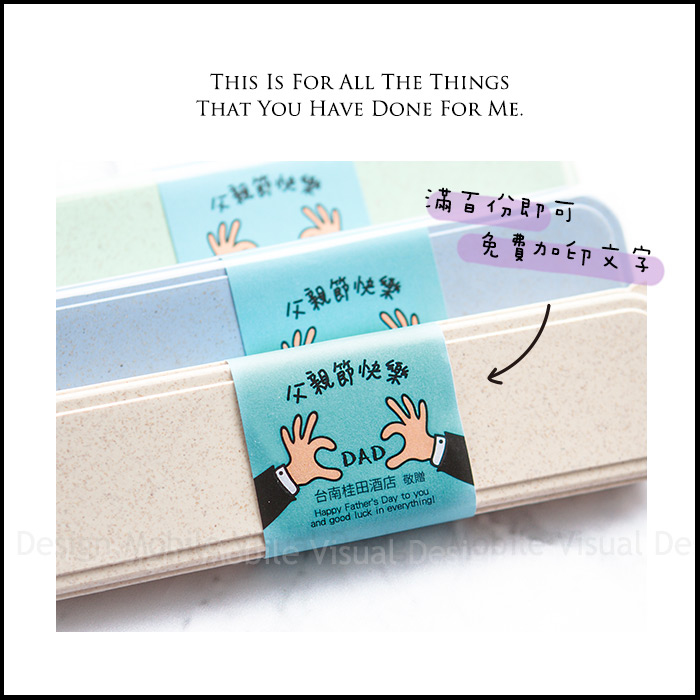 每份均有 1雙筷子 + 1支湯匙 + 1支叉子 作為禮物送老爸或拜訪客戶都絕對是超棒的禮物喔。 以PP+小麥桔梗料製成,耐高溫120度,健康環保,充滿自然氣息,北歐色系,簡約時尚,密封性佳,上班、旅遊、野餐、出差…等隨身攜帶,方便又健康! 顏色:北歐藍 ,北歐米,北歐綠 (可選色,若未事先選色則隨機出貨) 每份餐具組都貼有幸福朵朵獨家設計精美腰封,訂滿100份餐具組還可以免費印文字喔!(若有需要,請在下單時就備註好要印的文字喔!沒有備註就會用公版腰封喔!) 100支以上65元 300支以上60元 500支以上55元 (恕不與其他優惠活動同時使用) |