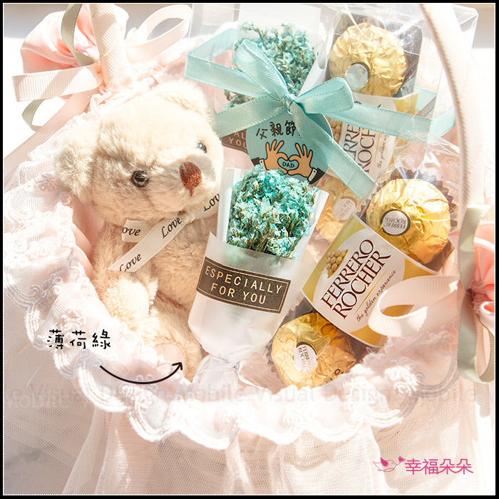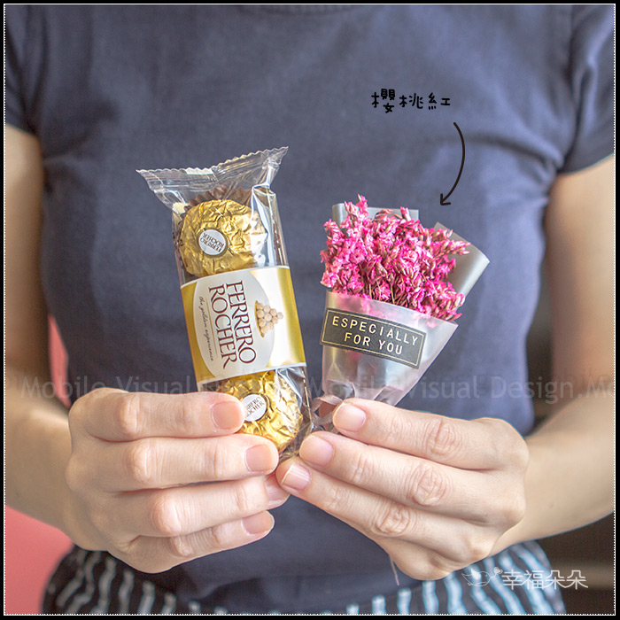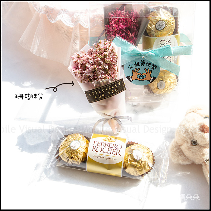 每盒均有 金莎巧克力3顆入 + 迷你乾燥花束1束 作為禮物送老爸或拜訪客戶都絕對是超棒的禮物喔。 迷你乾燥花束→每款都很經典漂亮! 珊瑚粉.櫻桃紅.風鈴紫.薄荷綠共有4色任君挑選✨