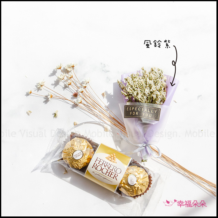 售價:150元/1盒(金莎巧克力3顆入+乾燥花束1束)