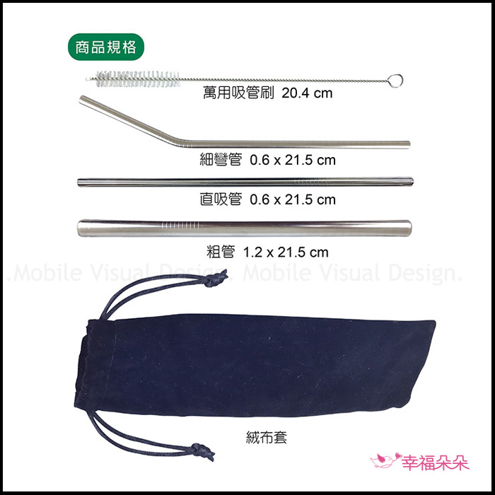 包裝約12x24.5cm 彎吸管0.6x21.5cm、粗直吸管1.2x21.5cm、細直吸管0.6x21.5cm、 萬用吸管刷20cm、黑色絨布套6.7x23.5cm 內容物手工測量,多少會有些微誤差喔! 不介意才下訂 |