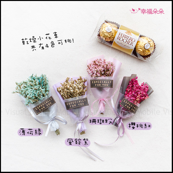 每盒均有 金莎巧克力3顆入 + 迷你乾燥花束1束 作為禮物送女友或拜訪客戶都絕對是超棒的禮物喔。 迷你乾燥花束→每款都很經典漂亮! 珊瑚粉.櫻桃紅.風鈴紫.薄荷綠共有4色任君挑選✨