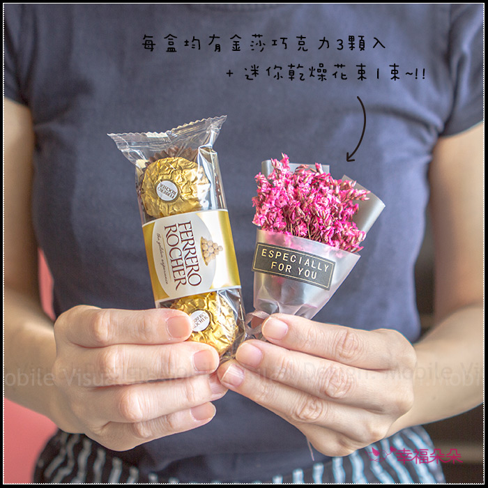 上市特價: 99元/1盒(金莎巧克力3顆入+乾燥花束1束) |