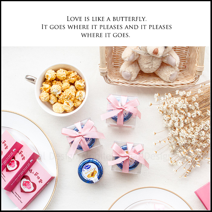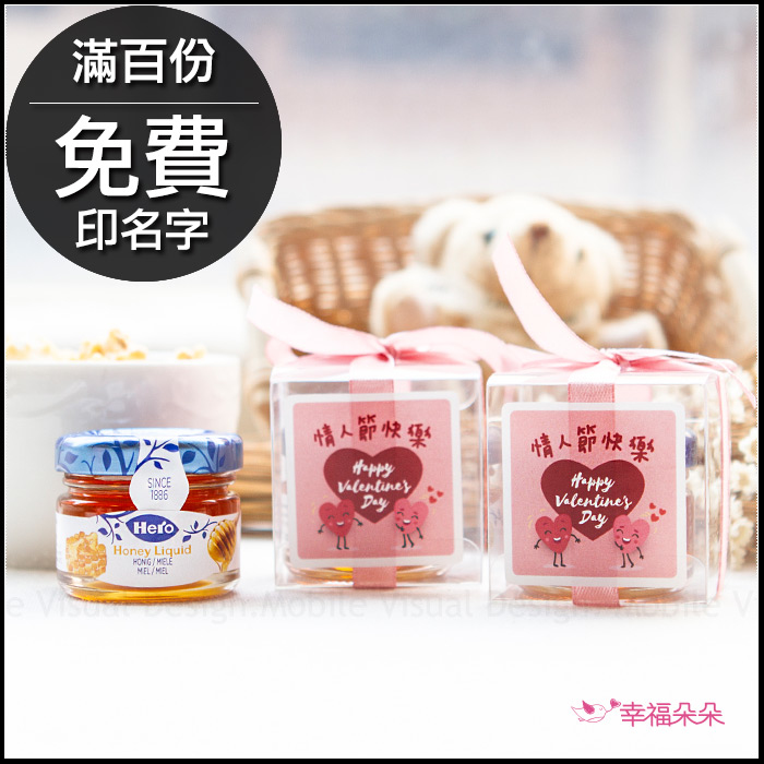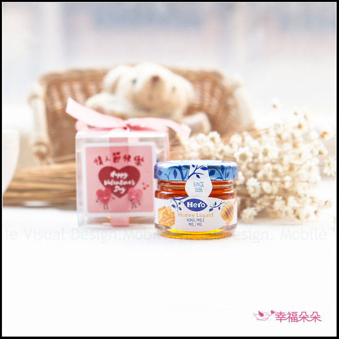 *透明盒裝瑞士最有名的Hero小蜂蜜,繫上粉色緞帶,象徵甜甜蜜蜜,成為超夯的小禮物。 每盒都貼有幸福朵朵獨家設計[情人節]精美貼紙,非常溫馨可愛🥰