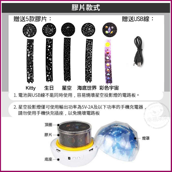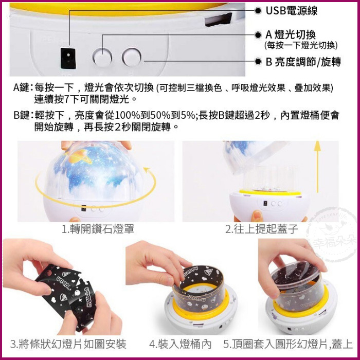 [使用說明] 💖基本白光可做小夜燈使用 💖獨家旋轉功能加強版,按B鍵切換夜燈、投影模式(長按B鍵可以旋轉) 內附五款長條投影膠片(生日/星空/彩色宇宙/海底世界/隱藏版) 五款圓頂(生日/星空/彩色宇宙/海底世界/隱藏版) 💖要投射到天花板上時,外罩打開即可開始投影 💖藍/白/黃三色光源,可創造不同投影效果 💖燈光亮度有三檔可以隨意調節,寶寶睡覺就可以調節最低亮度,不傷眼哦! 💖電力來源:使用USB充電(有附USB插頭), 或電池(3顆三號 一般碳鋅電池,請勿使用鹼性電池哦) 電池與USB線不能同時使用,容易燒壞星空投影燈的電路板。 星空投影燈僅可使用輸出功率為5V-2A 請勿使用手機快充插座,以免燒壞電路板。 💖尺寸:寬13.3cm*高12.7cm ; 重量:400g 💖材質:ABS+PC 環保塑料 ( 非玻璃水晶,較安全) 💖電壓:通用 💖商品圖片會因顯示器不同而有些微色差,請見諒 【商品特點】 ‧三段變光 – 可切換浪漫情境到助眠微光 ‧三色燈光 – 白、黃、藍三色,可疊加使用 ‧幻燈片投影 – 附五種幻燈片,投影慶祝 【內容物】 星空投影小夜燈x1 幻燈片x10(長條X5+圓頂X5,有1組彩色宇宙已預裝在小夜燈上) USB充電線x1 使用說明x1 精美盒裝x1 |