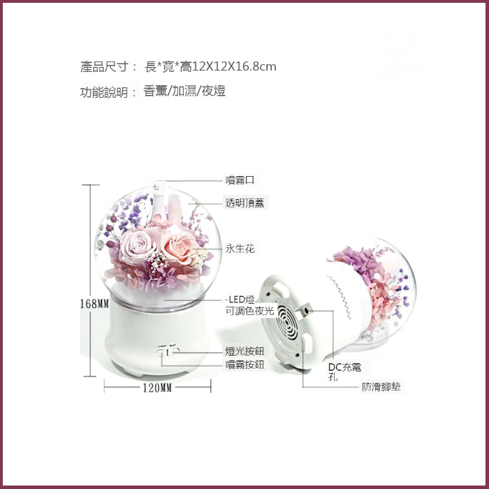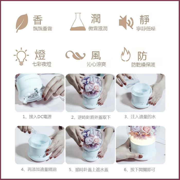 花束輔材:永生花 適用場景:會議,其他,友情,周年紀念,商務,婚禮,探望,愛意表達,生日,祝福 適用對象:客戶,朋友/同事,愛人,老師,領導/長輩 1.靜音運作:分貝低,不影響睡眠的加濕器,安眠無憂,無輻射。 2.七彩夜燈:七種顏色燈光,溫柔循環播放,使整個空間都在溫馨的畫面中長存。 3.斷電保護:強大的斷電保護,缺水立即斷電,側翻立即斷電,防止乾燒,更好保護加濕器。 4.兩檔噴霧:兩檔噴霧設計,滋潤肌膚,特別是夏天開空調的時候,加濕補水必備神器,不再乾燥。 5.多種款式:多種款式選擇,多款真花保存,選擇自己喜歡的花色物語,讓整個夜晚有補水,有花,有燈的溫馨相伴。 注意事項:因為是真花製成的永生花,所以每個花朵大小不一定會一樣,運送中可能會造成花朵些微掉落是正常的~介意者請勿下訂喔!謝謝您 產品解說: 產品名稱:永生花薰香機 產品功率:10W 主要材質:PP+ABS+天然花材 工作時長:大霧3小時,小霧6小時 定時時長:60分鐘自動斷電 霧化震動頻率:2.4MHZ 裝水容量:100ML 主要功能:香薰/加濕/夜燈/補水 使用範圍:10-20平方米 電源適配器:DC12V/1A 產品顏色選擇:清新粉紫、復古藍卡 加濕器使用步驟: 1.接入DC電源 2.逆時針將外蓋取下 3.注入適量的水 4.再添加適量精油 5.順時針蓋上遮水蓋 6.按下開關即可 以愛相約 愛,從永生花開始 加濕助眠,自然放鬆 源用自然加濕補水進出噴霧原理,加入精油,保留噴霧活性成份之餘,同時香氣霧氣擴散高效均勻 用鍾愛的芳香,縈繞整個房間 滴入精油或香水,用你的喜愛的香氣,隨霧散發給你滋潤的擁抱,讓身心得到放鬆,舒緩心情 智慧氛圍夜燈 溫馨暖光模式,七彩漸變模式 設有常亮功能,可隨心調節燈光,營造舒心氛圍 裝飾永生花景觀設計 天然永生花保持了鮮花質感,持久保存,永不凋謝 將永生花香薰燈,送給你愛的人 高透明度PET材質景觀罩 透明的質感,360度展示永生花材,不易破碎,環保無毒材質