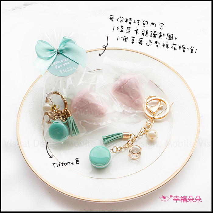 每份精巧包內有 1條馬卡龍鑰匙圈 + 1個草莓棉花糖 喔!! 法式浪漫的馬卡龍造型鑰圈,搭配韓風時尚流蘇綴飾及珍珠、鑽飾,是一份實用又時尚的禮物喔! 鑰匙圈共有2色可挑:Tiffany色、粉色🥰 未指定顏色者均採隨機出貨喔! 超可愛草莓造型棉花糖,口感綿綿的,吃起來甜在心頭😋 保存方式:存放於乾燥陰涼處即可 保存期限:至少半年以上 每份精巧包均會繫上幸福朵朵獨家設計精美小吊牌!訂滿100份還可以免費印文字喔!(若有需要,請在下單時就備註好要印的文字喔!沒有備註就會用公版吊牌喔!) 此款商品在婚宴上或任何場合宴會上都是一種非常受歡迎的玩具禮盒唷!CP值爆表款!送小朋友、婚禮小物、迎賓、二進 都非常適合! *偶有微瑕完美主義者請繞道喔 ♥︎若大量訂購下訂前務必先詢問是否有足夠數量的庫存! |