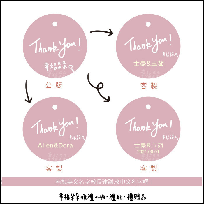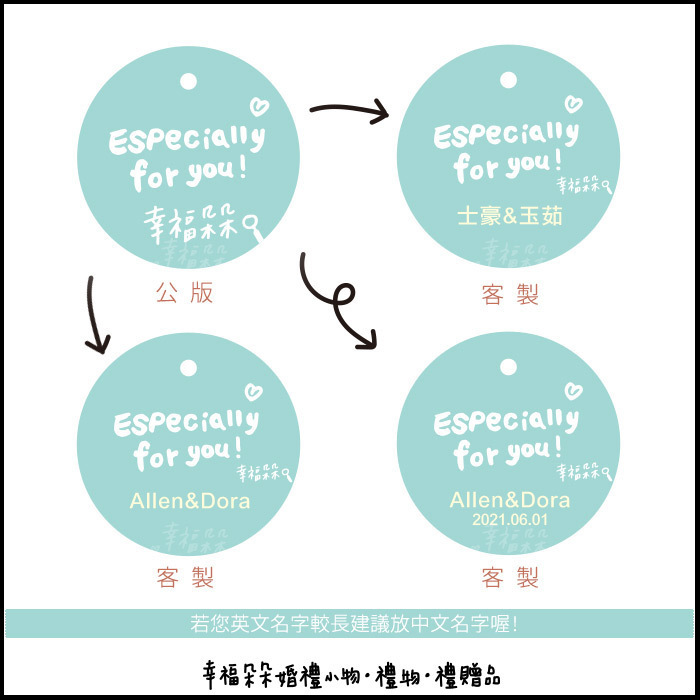 *單筆訂購滿100份以上可以於吊牌上免費加印客製文字! (若需要,請在下訂時先備註,若未事先備註,視同放棄喔!) (文字愈多字級相對愈小喔!圖10圖11範例是9級字,給您參考!) 單筆訂購未滿100份則皆為用公版吊牌出貨!