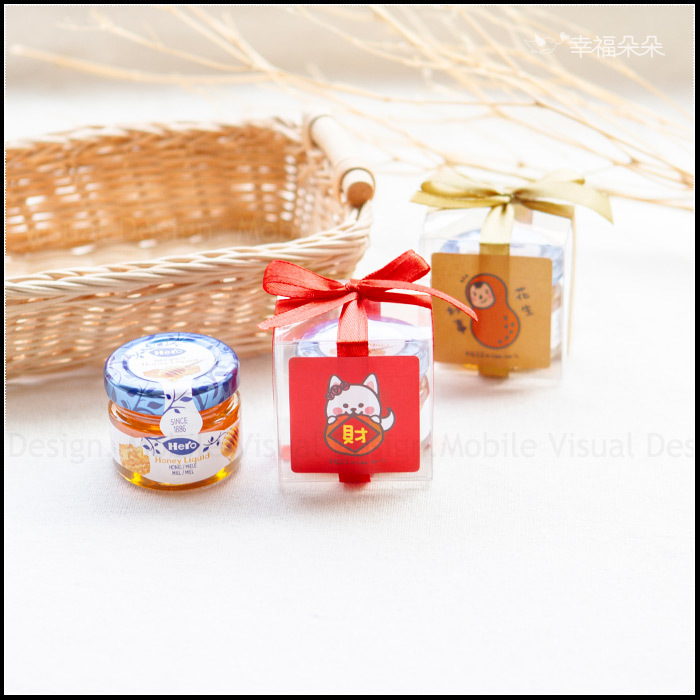 *透明盒裝瑞士最有名的Hero小蜂蜜,繫上紅色緞帶,象徵甜甜蜜蜜,成為超夯的小禮物。 每盒都貼有幸福朵朵獨家設計精美貼紙,非常溫馨可愛🥰