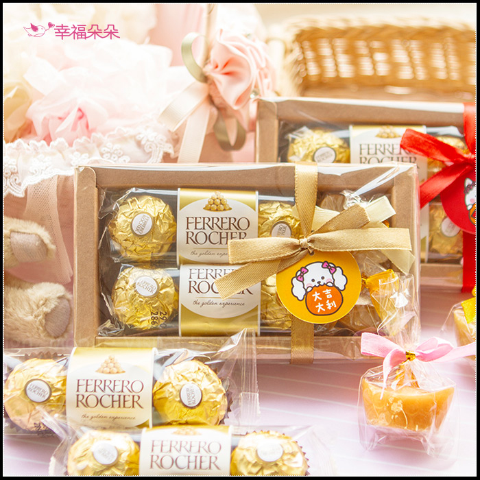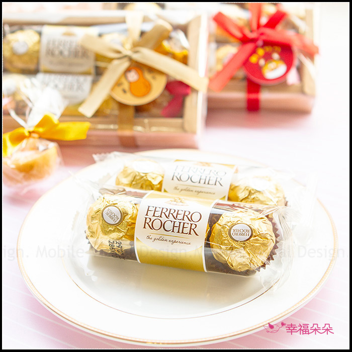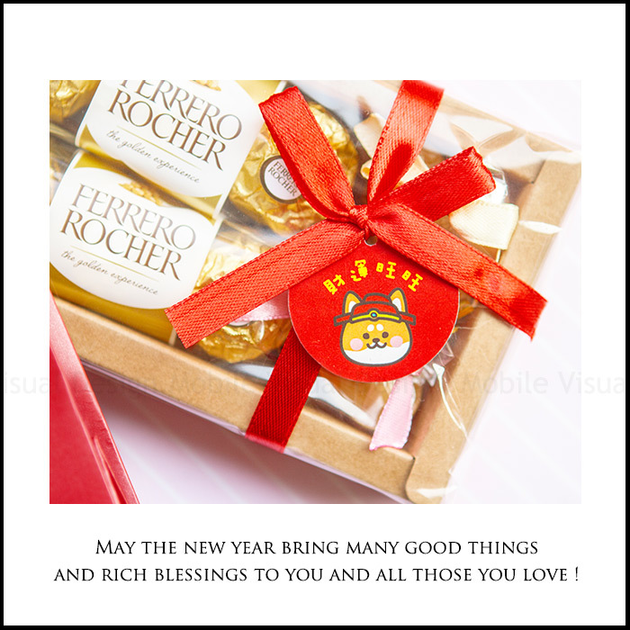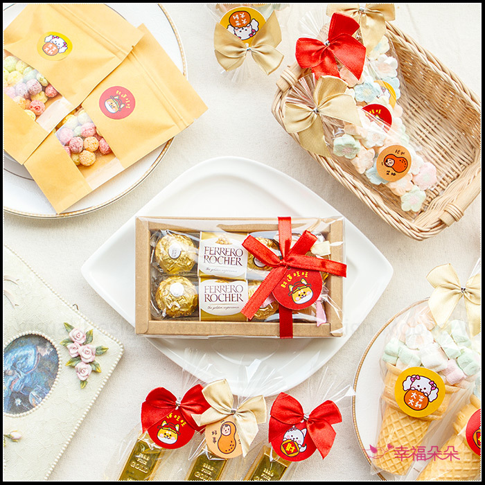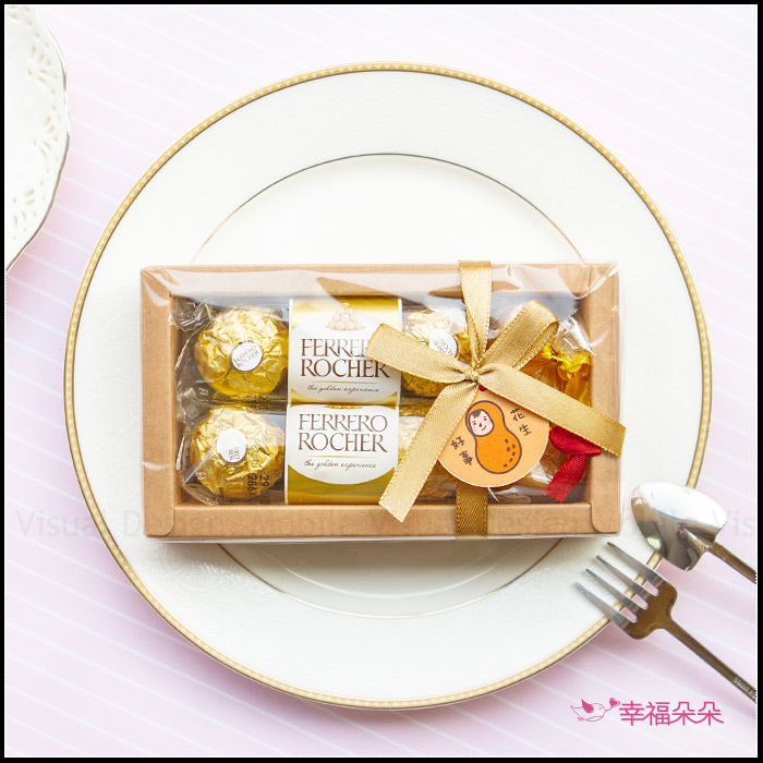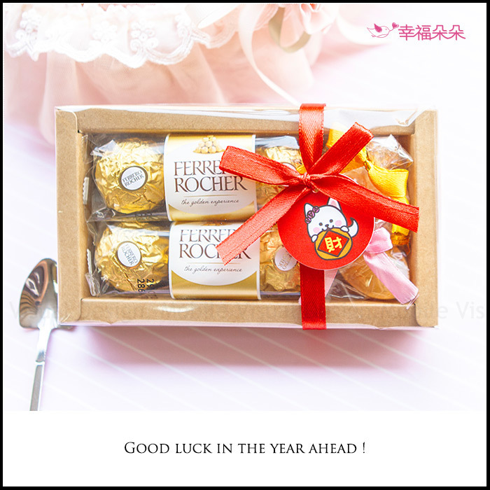 每盒均有 金莎巧克力6顆入 + 金元寶香皂2個入 並繫上幸福朵朵獨家設計4款吊牌(依數量平均分配) !