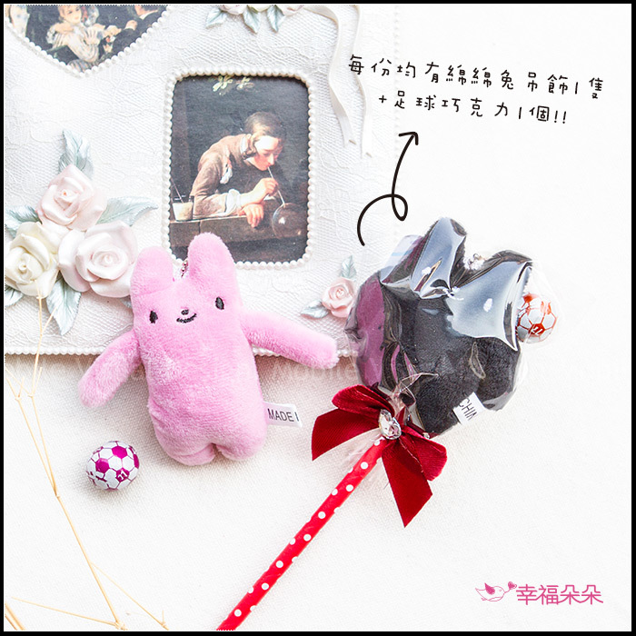 每隻小兔皆是使用短毛絨面料製成,精緻電繡,觸感柔順,並以可愛小巧的造型來討你歡心💖 多種顏色皆採隨機出貨! 恕不挑色喔! 每支糖果棒均有 1隻綿綿兔吊飾 + 1個足球巧克力 喔!! 水鑽蝴蝶結顏色也是採隨機出貨恕不挑色~ 在婚宴上或任何場合宴會上是一種非常受歡迎的玩具組合唷! 每個皆有透明袋子保護裝好(現貨供應中) 足球巧克力保存方式:存放於乾燥陰涼處即可 保存期限:至少半年以上 ♥︎若大量訂購下訂前務必先詢問是否有足夠數量的庫存! |