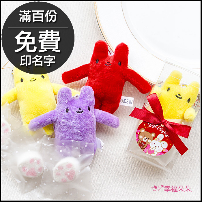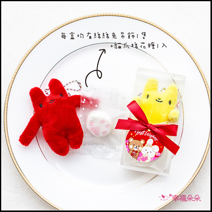 每隻小兔皆是使用短毛絨面料製成,精緻電繡,觸感柔順,並以可愛小巧的造型來討你歡心💖 多種顏色皆採隨機出貨! 恕不挑色喔! 每盒小禮物內有 多彩綿綿兔吊飾(多色隨機)1隻 +貓爪棉花糖1入 喔!! 均會繫上幸福朵朵獨家設計精美吊牌!此款商品在婚宴上或任何場合宴會上都是一種非常受歡迎的玩具禮盒唷! 超可愛娃娃掛飾拿來裝飾在房間、包包上都超級適合唷! 作為生日禮物或送小朋友當獎勵都絕對是超棒的小物喔。 還可以加購小卡寫下你的祝福送給對方~