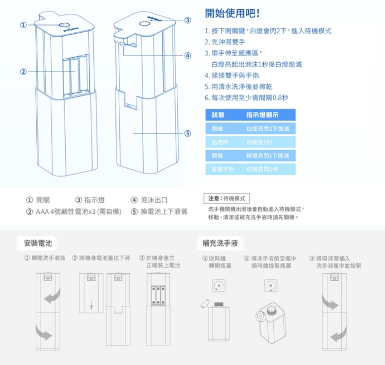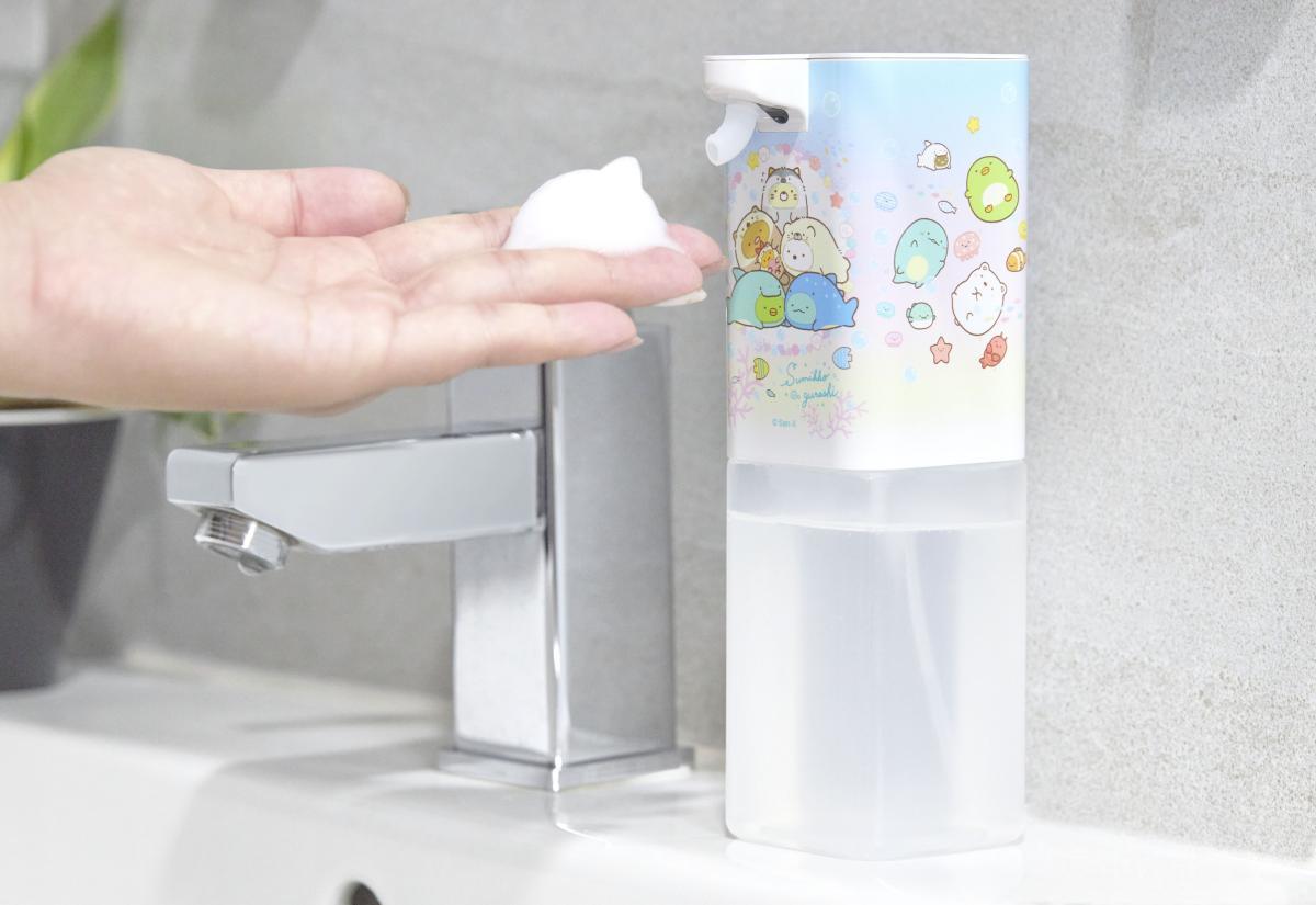 新冠肺炎、腸病毒、流感病毒...... OUT! SAN-X角落小夥伴元素設計 讓孩子快樂洗手,養成健康衛生的好習慣! 【產品特色】 ❋SAN-X官方正式授權商品 ❋超可愛角色設計,兼具實用與收藏價值 ❋紅外線自動感應出泡,避免接觸而交叉感染,衛生加倍 ❋便捷的出泡方式,讓小朋友也喜歡上洗手 ❋微米級孔徑泡沫篩網,綿密泡沫深度潔膚 ❋泡沫定量釋出,用量節省,節約不浪費 ❋採用可重覆補充洗手液的容器設計 ❋微型高效電機、減震結構設計,低功率更安靜 ❋防潑濺水,採環保材質 ❋小巧不占空間,可融入不同的使用情境 ❋台灣設計製造 *請務必使用鹼性電池才有足夠電力驅動產品運作,使用碳鋅電池可能因電量過低而無法出泡,或使用幾天就無電。 *本產品需自備慕斯型洗手液(量販店、超商、網路皆有販售),請避免加水稀釋。 *請勿添加酒精、乾洗手、洗手乳等非慕斯型洗手液液體。 【規格】 尺寸:19.3x5.8x8 公分 容量:250 ml 重量:約185克 材質:PC/ABS+PP 電池:使用AAA 4號鹼性電池或1.5V以上的充電電池x3 (如勁量牌,需自備) 功率:4.5V/0.18A (0.8W) 單次出泡量:1秒/1.5 ml 產地:台灣 【使用方式】 ❋洗手機按下開關鍵,白燈會閃2下,進入待機模式 ❋建議先沖洗雙手 ❋單手伸至感應區,白燈亮起出泡沫1秒後白燈熄滅 ❋揉搓雙手與手指 ❋用清水洗淨後並擦乾 ❋每次使用至少需間隔0.8秒 【常見問題】 1:無法出泡泡 處理方式:請確認以下要點 -請使用全新鹼性電池 -補充瓶內,長長細管子有無脫落 -補充液液體請裝充足 (建議超過一半) 【注意事項】 ❋未滿9歲孩童使用時建議有大人在旁