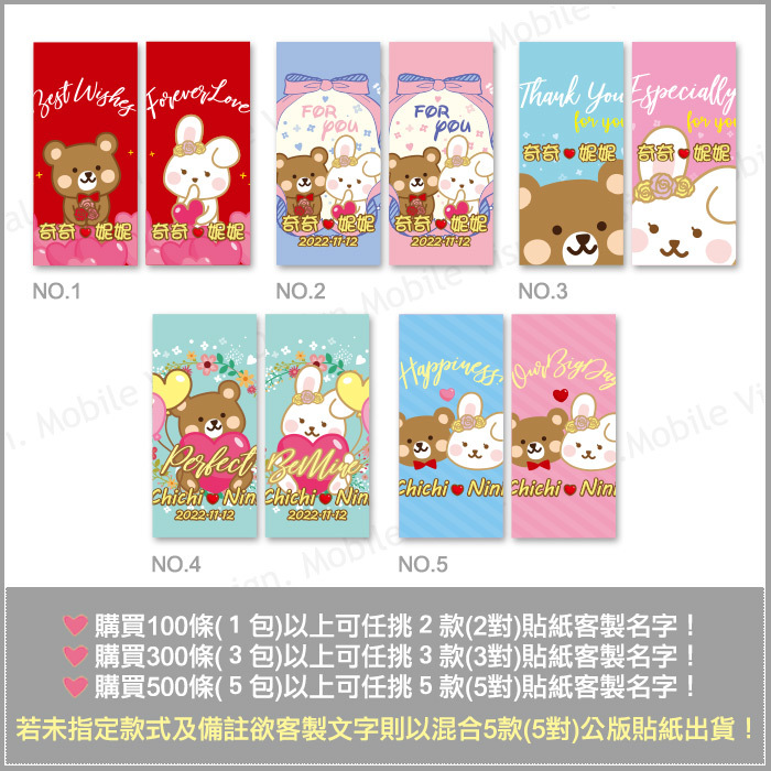 則以5款公版依您下訂的數量平均出貨 👉 100條(1包)以上可任挑2款(2對)貼紙! 加上姓名(中英文請2選1)、依數量平均分配 👉 300條(3包)以上可任挑3款(3對)貼紙! 加上姓名(中英文請2選1)、依數量平均分配 👉 500條(5包)以上可任挑5款(5對)貼紙! 加上姓名(中英文請2選1)、依數量平均分配 *保存方式:存放於乾燥陰涼處即可 *保存期限:至少半年以上(最佳賞味期2~3週內) *接單後排單交貨(趕件者請先詢問時間),賞味期約半年~1年。 *非常適合當作送客喜糖、二次進場禮、來店贈品等! 量大優惠↓