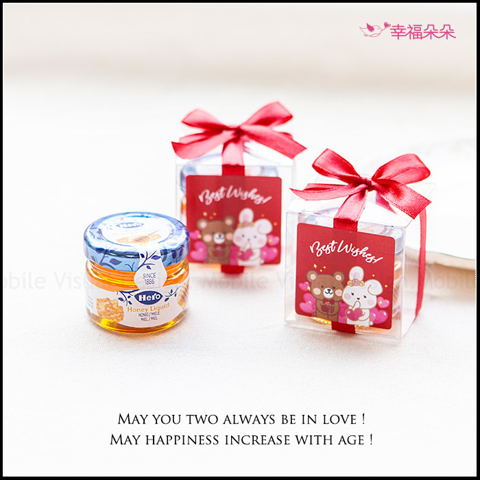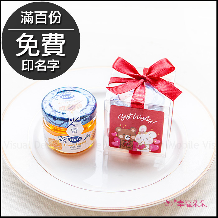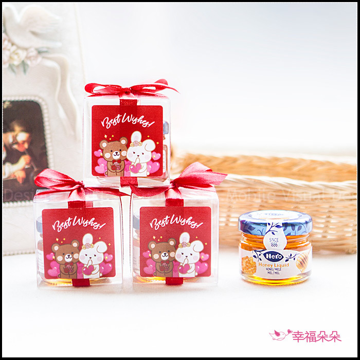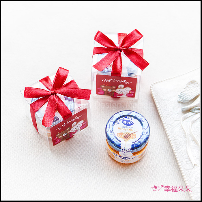 *透明盒裝瑞士最有名的Hero小蜂蜜,繫上紅色緞帶,象徵甜甜蜜蜜,成為超夯的小禮物。 每盒都貼有幸福朵朵獨家設計[奇奇與妮妮]精美貼紙,非常溫馨可愛🥰