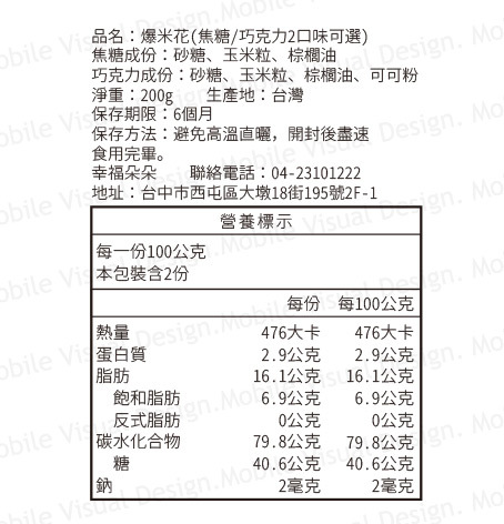 焦糖口味:砂糖、玉米粒(非基因改造)、棕櫚油 巧克力口味:砂糖、玉米粒(非基因改造)、棕櫚油、可可粉 |